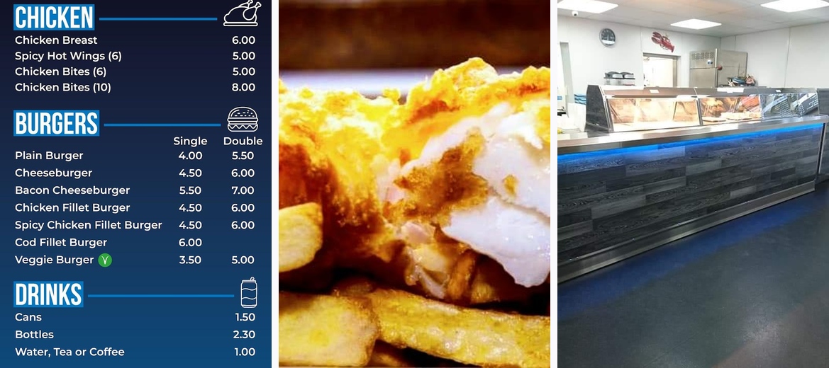The menu features a variety of fish including cod, chunky cod bites, and large Scottish haddock, all expertly cooked to perfection.